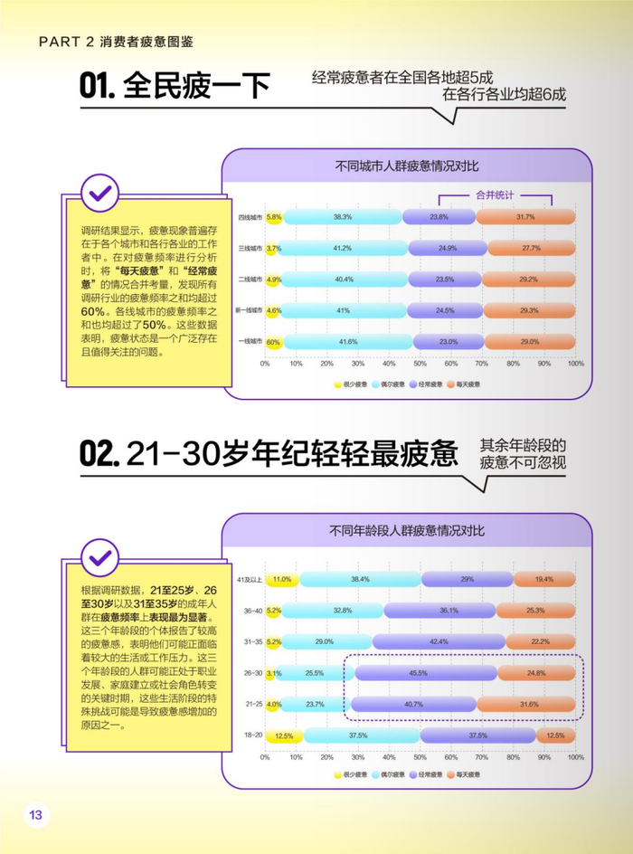 不仅如此,该调查数据还显示,21至25岁、26至30岁以及31至35岁的成年人群在疲惫频率上表现最为显著,而金融行业的从业人员成为“最累打工人”,每天疲惫占比超过30%。