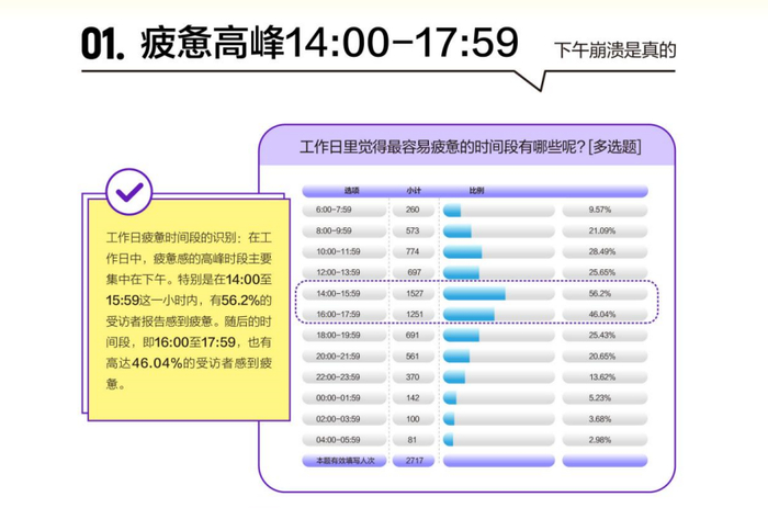 有意思的是,当被问到疲惫时间点相关的问题时, 42.69%的受访者普遍认为周一“最疲惫”,而一天中最疲惫的时间段则是14:00至15:59(有56.2%的受访者投票选择了这一时间段),“打工人的下午都是崩溃的”这一说法被证实。