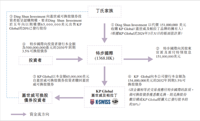 为精简财务安排,KP Global将向特步发行价值1.54亿美元、为期八年的可换股债券。该债券金额相当于KP Global自2019年被收购以来的累计亏损,以及截至2024年3月底的资本投资及营运资金。该债券的年利率为 3.5%,与特步向高瓴提供的利率一致。特步有权在未来八年内将该债券转换为KP Global 30%的股权。
