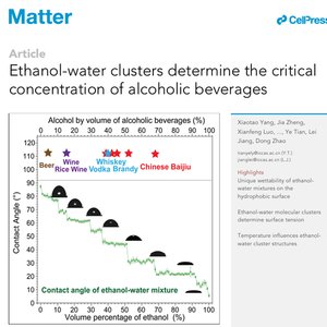 近日,五粮液风味研究团队联合中国科学院理化技术研究所江雷院士研究团队完成一项创新研究成果在材料学顶级期刊《Matter》(影响指数22.6,影响因子18.9)上发表。该研究论文题为Ethanol-water clusters determine the critical concentration of alcoholic beverages(酒精-水团簇决定了酒精饮料的特殊酒度),揭示了世界范围内黄金酒度区域包括:啤酒(~4%vol)、葡萄酒和黄酒(11-16%vol)、威士忌和白兰地(40-43%vol)、白酒(35-42%vol、~52%vol、~68%vol、~75%vol),证实了目前流行的各类饮料酒酒精度数的科学性与合理性,是目前我国酒行业在国际权威刊物上发表的最具影响力的顶级研究论文。