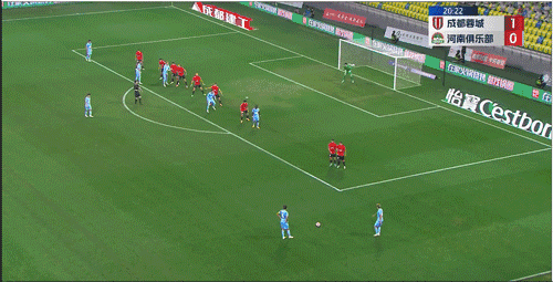 第20分钟,河南队获得前场右路任意球机会,纳萨里奥出其不意直接攻门,球打穿人墙直接入网,双方战成1:1。