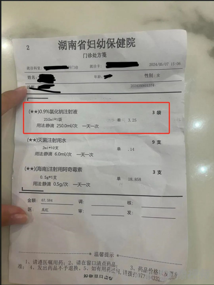5月9日,湖南一网友在社交平台上发布信息称,湖南省妇幼保健院开具的门诊处方笺中有氯化钠注射液,即生理盐水,但是她拿到药品后发现,至今其已经过期了至少8个月。