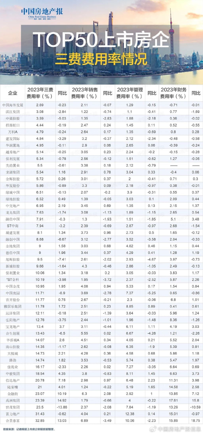 TOP50上市房企费用管控比拼 中海三费费率低至2.69%成行业第一