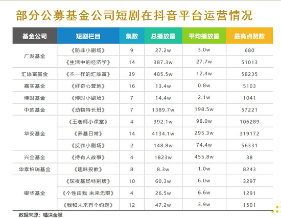 继视频直播后,短剧情视频(下称“短剧”)正在成为基金公司新媒体品牌营销的潮流趋势。财大气粗的头部公募在抖音等平台上的短剧节目,目前已呈现出了一定的人气,最高播放量甚至超过4100万。无疑,这些节目更接地气,更贴近受众生活经验,情绪共鸣比专业说教更加容易吸引粉丝。
