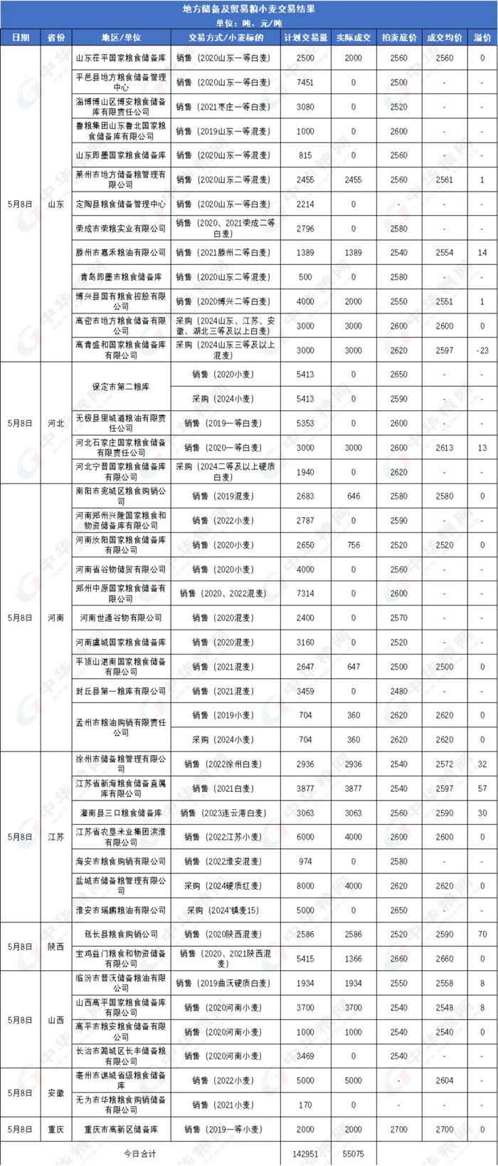 (1)5月10日威海市国家粮食储备库有限公司采购2024年产非雨后非烘干小麦4000吨,全部成交,底价2670,成交价2670。
