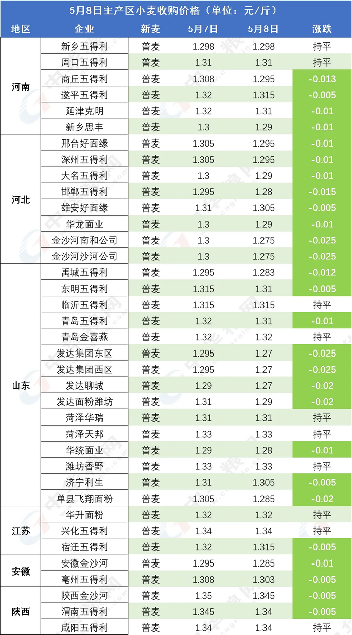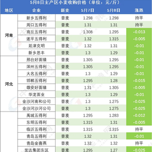 市场监测:5月10日国内小麦价格继续下跌,下跌幅度0.5-2.0分/斤,价格范围在1.265-1.345元/斤,均价1.293元/斤。不完全统计(重点监测的产销区),地储共投放28.11万吨,共成交9.03万吨,成交率32.1%;中央储备无。