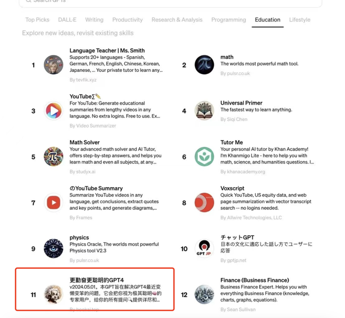答案或许并不乐观。首先,能把GPT这个看似门槛不高的大模型玩透,其实不是一件容易的事情。在采访前做功课时,我无意间发现,一款排在GPT插件榜单前列的GPTs(为特定用途而训练的GPT,也可以理解为是用户在GPT上为自己定制的软件),就是陈云飞本人研发的,那也是全球TOP 20 GPTs中唯一的一个中文GPTs。