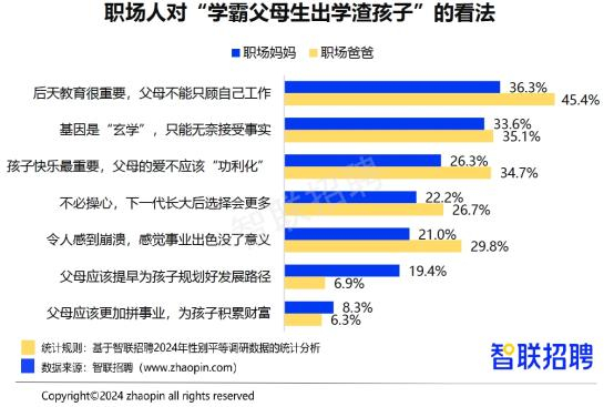 子女成才是父母的共同期盼,但孩子的表现却并不一定与父母的优秀程度呈正相关,“学霸父母生出学渣孩子”曾掀起多轮讨论。面对不够优秀的孩子,“后天教育很重要”是父母的共识,分别有36.3%的职场妈妈和45.4%的职场爸爸做出这一选择,占比居首。