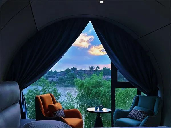 太空舱住宿:白色的外墙设计,搭配仿太空舱的外形、全景弯曲玻璃窗,可以足不出户揽星辰明月、观水镇夜景。