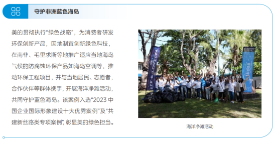 在发展运营过程中美的集团还坚守生态红线,积极关注生物多样性保护工作,美的空调因地制宜应用创新绿色科技,在南非、毛里求斯等地推广适应当地气候的海岛空调,开展海洋净滩活动;智能建筑科技举办“海洋碳循计划”City Walk净滩活动,携手志愿者、社区居民等组成“碳”路团队,守护蓝色海岸线。