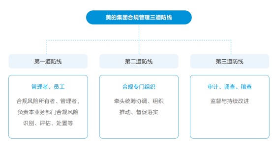 为了进一步提升治理效能,美的集团建立了合规管理体系,通过三道防线的构建,强化了合规风险的识别、评估及防控。同时,美的集团还积极参与合规文化建设,通过内部通讯平台和培训活动,提高了员工的合规意识和风险防范能力。