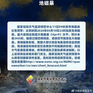 国家空间天气监测预警中心5月11日09时发布地磁暴红色预警:北京时间2024年05月10日23时起发生地磁暴,最大级别达到超大地磁暴(Kp=9)水平,预计未来24小时,磁暴过程仍将持续,后续仍可能发生大地磁暴。