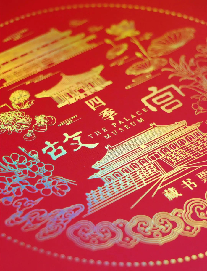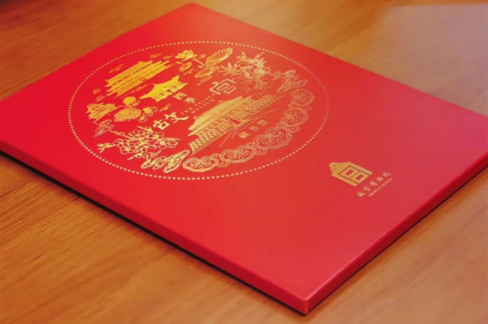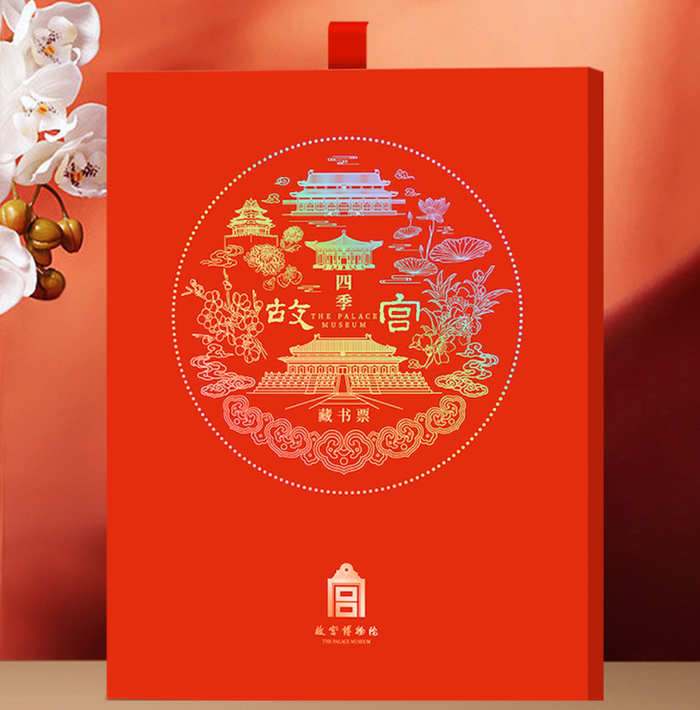 藏书票外包装,采用朱红为主色调,演绎故宫四时美景,仿佛千般风景尽在眼前。
