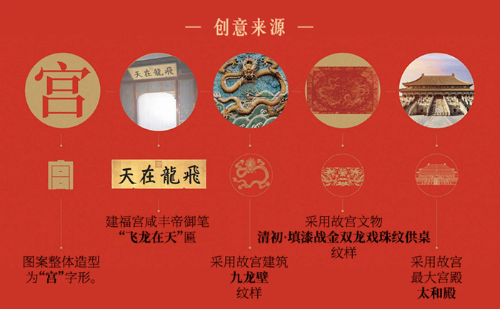 印有烫金的“宫”字徽标,细节满满。环绕着“春”“夏”“秋”“冬”四字的是双龙戏珠图腾,它们或盘绕或腾空,栩栩如生,寓意着龙腾四海,瑞气盈门。