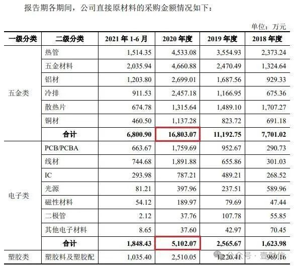 据创业板招股书,2020年九州风神五金类、电子类、塑胶类、配件类、包材类及其他原材料的合计采购分别为16,803.07万元、5,102.07万元、3,330.13万元、2,208.23万元、2,252.46万元和1,306.01万元。