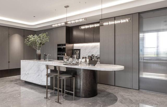 餐厨空间,面宽达到惊人的约8.4米,以超大西厨岛台为视觉中心,首创三面背景墙设计,木饰面搭配的“盘扣”元素,极为吸睛。
