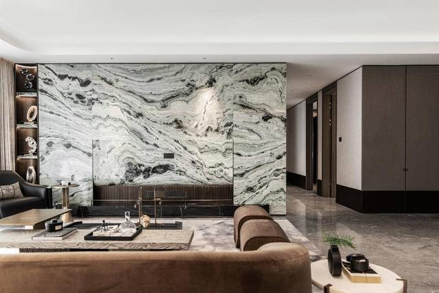 电视背景墙,甄选香格里拉的原石——云中翡翠,让东方写意的波澜之美倾泻而下,下方也是圆润弧角切面,上下形成呼应。