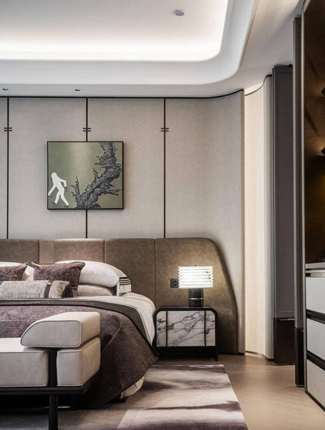 主卧内也有大量的弧度设计,圆弧吊顶的双重层次、取意中式屏风的背景墙弧形包裹式设计,与浅灰色磨砂皮革的独特质感交相辉映,赋予环境高贵而又宁静的气息。