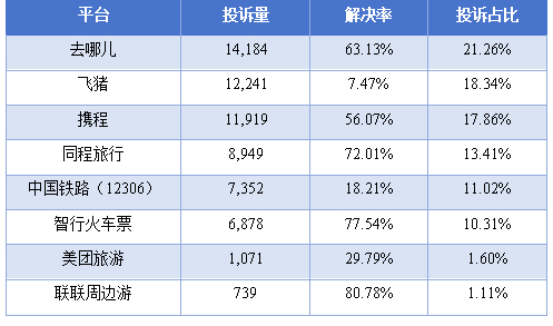 同程旅行和中国铁路(12306)位列投诉榜单前五,其中同程旅行的投诉解决率达72.01%,而中国铁路(12306)仅为18.21%。