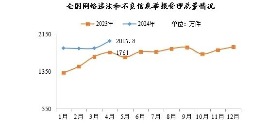 2024年4月,中央网信办举报中心指导全国各级网信举报工作部门、主要网站平台受理网民举报色情、赌博、侵权、谣言等违法和不良信息2007.8万件,环比增长8.3%、同比增长14%。其中,中央网信办举报中心受理举报42.6万件,环比增长2.7%、同比下降42.5%;各地网信举报工作部门受理举报151.1万件,环比增长46.7%、同比增长204%;全国主要网站平台受理举报1814万件,环比增长6.2%、同比增长10.8%。