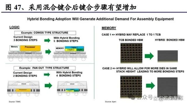 HBM 未来有望采用混合键合,由于混合键合是直接键合、不用环氧塑封料填充, 因此可以实现更薄的 HBM 厚度或更多层的 DRAM 堆叠。目前混合键合处于蓬勃 发展的早期,设备出货量和市场规模还相对较小,未来随着存储和逻辑等领域均 有望更多采用混合键合,其设备市场想象空间巨大。 当前全球晶圆键合设备主要由 EV Group、Besi 等少数海外厂商主导,而国内拓荆 科技(混合键合设备)、芯源微(临时键合和解键合设备)、上海微电子等厂商 也在有序布局和突破。