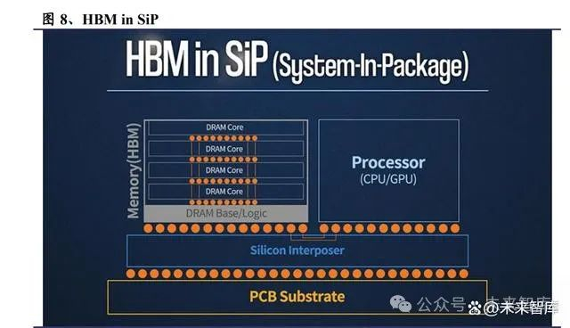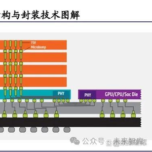 如前文所述,HBM 由数个 DRAM 颗粒和基础/逻辑颗粒(Base/Logic Die)垂直堆 叠组成,其后一般会采用 CoWoS 工艺,将 HBM 与 GPU/CPU/SoC 通过中介层 (Interposer)集成在同一封装体中,最终形成 AI/HPC 等应用所需的芯片。