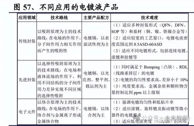 电镀液是电镀工艺使用的配方型化学品,由主盐、导电剂、络合剂及各类电镀添 加剂组成,其中电镀添加剂是影响电镀功能的核心组分。电镀添加剂通常在电镀 液中含量极少,但具有显著改善电镀液和镀层的各种物理性能的作用,可实现平 整镀层表面、降低电极与溶液界面张力、提高镀层韧性、降低镀层内应力或使镀 层结晶更加细致等功能。缺少合适电镀添加剂的电镀液无法正常工作,不能镀出 合格的镀层。电镀效果由各组分的品质、配比、化学特性,以及电镀工艺参数(温 度、电流密度、电镀时间等)共同决定。 据 TECHCET 数据,2023 年全球半导体电镀化学品市场规模约 9.9 亿美元,预计 2024 年将同比增长 5.6%至 10.47 亿美元,2027 年将达到约 12 亿美元。半导体电 镀液市场中,铜互连电镀约 6+亿美元,镀银锡/锡近1 亿美元,先进封装镀铜约 3+亿美元,镀镍也有一定市场。而根据中国电子材料行业协会的数据,2021 年国内 集成电路封装用电镀液及配套试剂市场需求为 1.5 万吨,其中先进封装和传统封 装的需求量比例大约为 1:2。