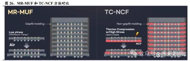 因此通过不同的键合和底部填充的结合,便形成了不同的方法,当前 HBM 中常 用的则主要为 TC-NCF 法和 MR-MUF 法,如同样为 HBM3E 产品,SK 海力士使 用了 Advanced MR-MUF 法,而三星则使用了 TC-NCF 法。