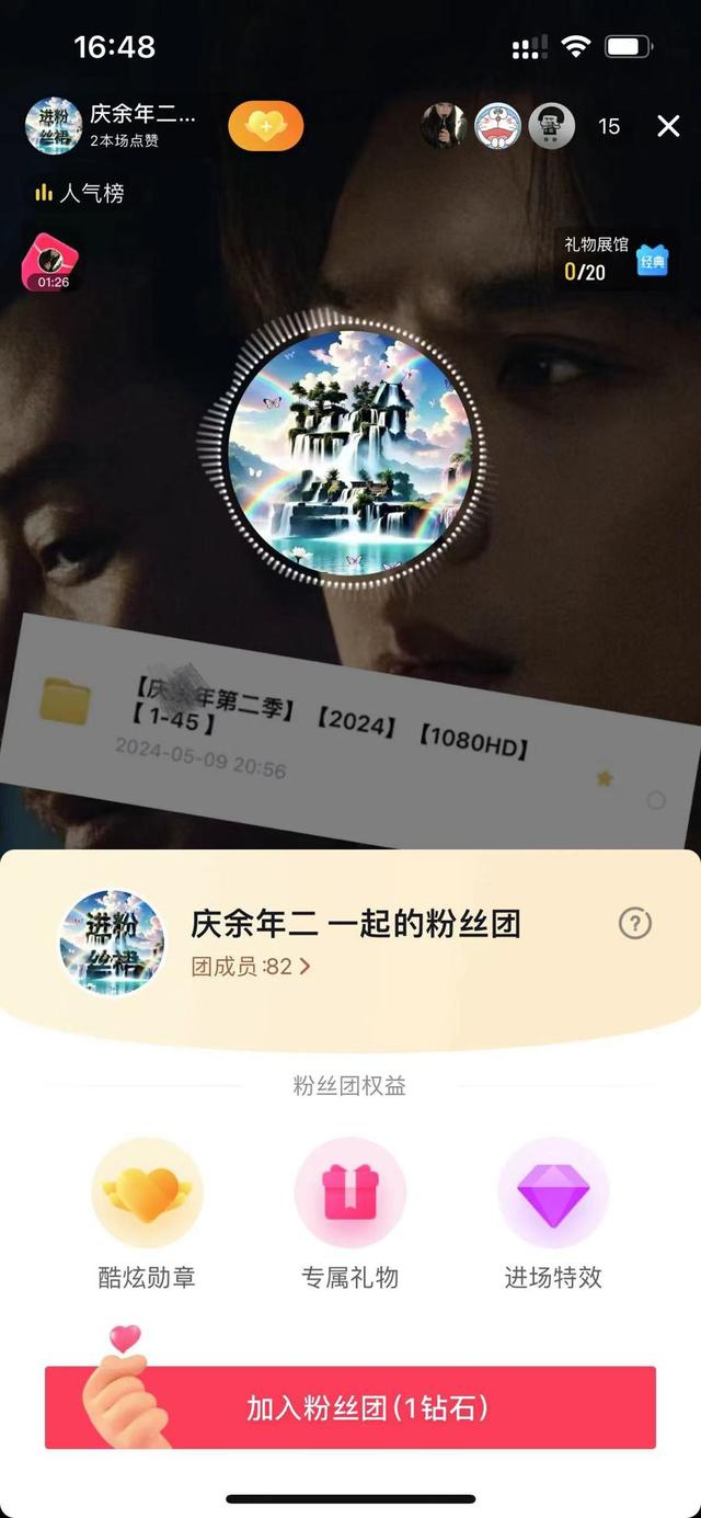 尽管这些直播间很快被封,但很快又有新的直播间冒出来。主播看似“真情实感”的分享,实际目的都是为了导流。“主播”会鼓动观众点关注、亮灯牌、加入粉丝团,扬言“下播后分享资源”;而加入该“主播”的粉丝团需要花费“1钻石(约等于0.15元)”。