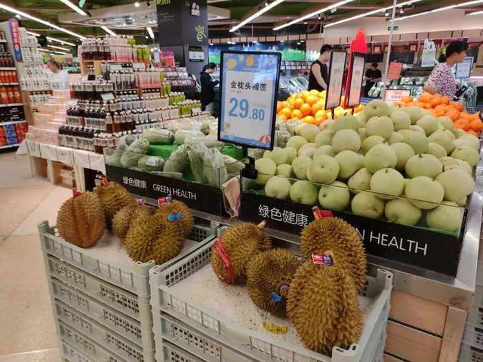 “榴莲自由”已成为商家甚至城市营销的热点。在线上渠道,商家开启直播开榴莲、互相比价等活动,并推出市内配送、“小时达”,吸引了不少消费者在线上下单。在刚刚过去的“五一”假期期间,河南洛阳开展了首届榴莲狂欢节活动,线上、线下总销售额超300万元。
