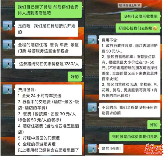 今年1月18日,江女士在网上查询云南旅游攻略时,认识了一名来自飞游国际旅行社有限公司(以下简称飞游国际)的导游小何。一番沟通后,小何为江女士一行5人制定了“昆明-大理-丽江-泸沽湖尊享云南8天7晚游”的休闲游,优惠价为1280元/人(不含机票)。小何称全程将由自己负责,并承诺无购物、无任何附加隐形消费。江女士一行人很快就交了定金,由对方代订机票。