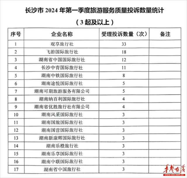 记者调查发现,今年4月12日,长沙市文化执法局发布了2024年第一季度旅游服务质量投诉数量统计表。在本次统计中,江女士投诉的飞游国际旅行社位列其中,且排名第二,投诉数量高达18次。