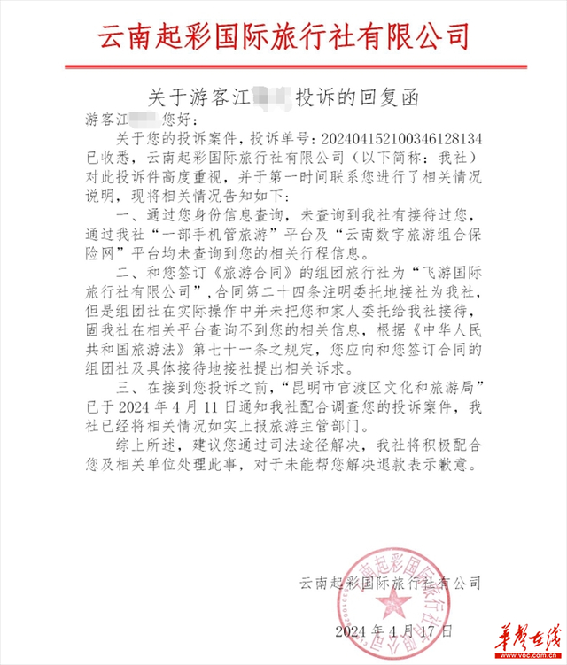 由于涉及长沙、昆明和丽江的多家旅行社,加上各旅行社提供的回复函或者说明材料说法不一,江女士维权陷入困境。