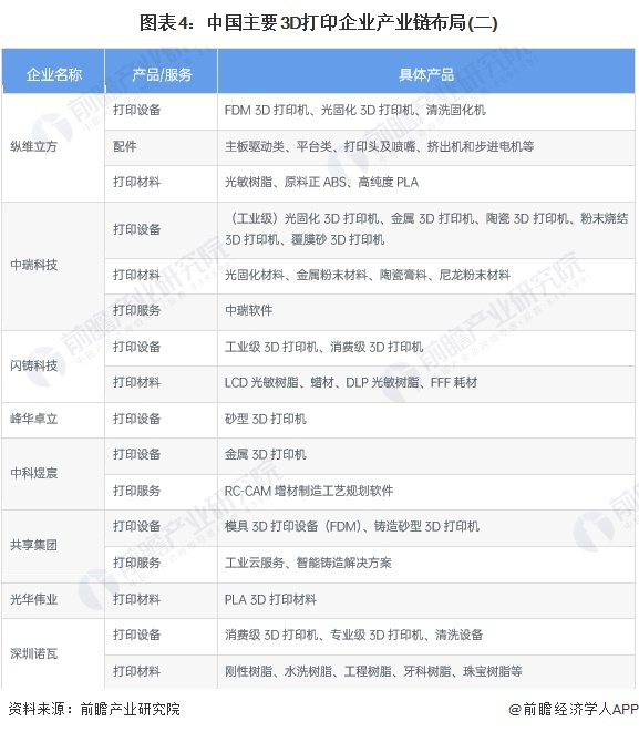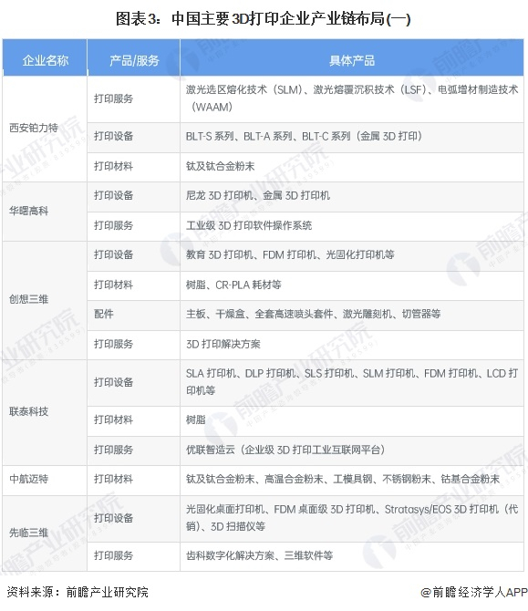3、中国3D打印行业产品布局