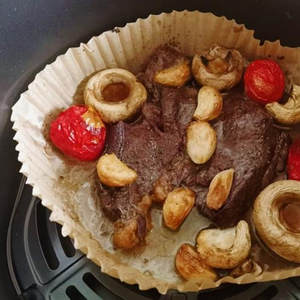4. 把牛排、口蘑、大蒜放入空气炸锅,200℃烤5分钟。