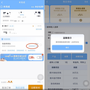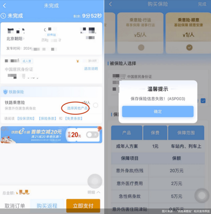 此外,记者实测发现,在12306 App购买火车票加购“铁路乘意险”时,点击“选择其他产品”后,如果在不同的保险版本中切换第二次时,界面便弹窗“保存保险信息失败”。比如,由1元的乘意险切换至3元,再切换回1元或更改至5元的版本,则系统会进行该提示。这一情况的出现,意味着用户无法任意次数地切换想要的保险版本。不过,在记者针对该问题致函中国铁路保险采访后,截至记者发稿,该情况已经不复存在。