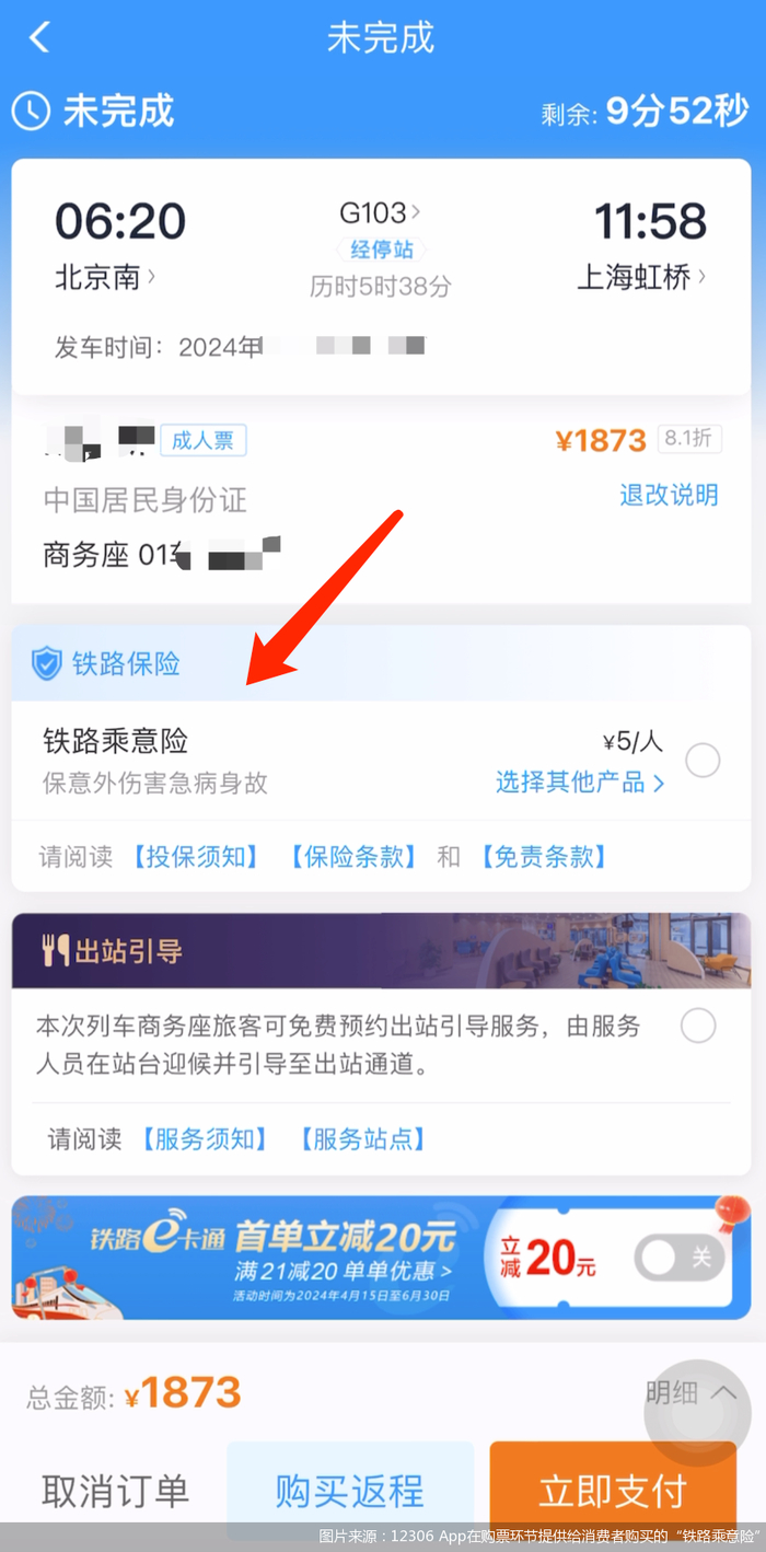 不只有发现自己莫名其妙投保了一份“铁路乘意险”的张帆(化名),还有发现“铁路乘意险”宣传与实际有落差的李响(化名)。比如,张帆本以为12306为其强制搭售了保险,但其通过再次购买等方式才消除了误会:因为自己购票时误触了保险购买选项。这背后,是点击购买保险选项时,没有任何其他提示,便直接成功与火车票一同进行了支付。