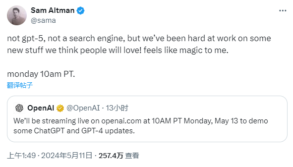 该公司CEO Sam Altman也粉碎了短期内GPT-5将发布的传闻,他在X上表示不会有新一代的大语言模型,也不会是搜索引擎。但即便不会有GPT-5和搜索引擎,OpenAI本周将演示的ChatGPT和GPT-4更新,预计也会有诸多升级和改进,Sam Altman在推文中表示,相信大家一定会喜欢这些新东西的。
