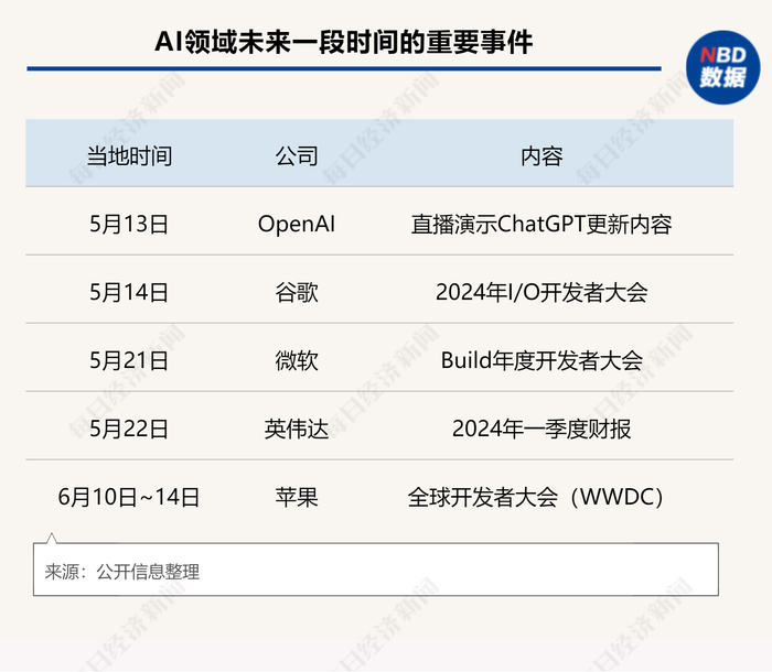 从OpenAI直播演示ChatGPT更新内容和谷歌的I/O开发者大会2024,到微软的Build年度开发者大会,“姗姗来迟”的英伟达一季报,再到苹果的年度开发者大会(WWDC),可以说,从生成式AI到AI硬件,关于AI的方方面面将贯穿未来的一个月。
