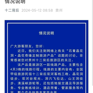 5月12日上午,贵州十二背后旅游区官微发布情况说明,称该产品是一款线路产品,主要包含4天3晚的线路行程。游客在抖音端口看到的每份9999元团购产品属简化标注引起的误解。该旅游区一工作人员向红星新闻表示,之前简化了名称,现在产品已标明清单。