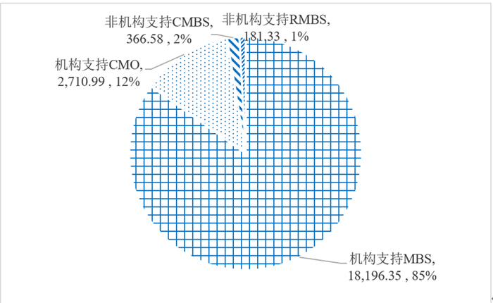 细分品类方面,2022年度美国市场MBS产品中,机构支持MBS、机构支持CMO、非机构支持CMBS、非机构支持RMBS发行规模分别为18,196.35亿美元、2,710.99亿美元,366.58亿美元和181.33亿美元,占比分别约为85%、12%、2%和1%。
