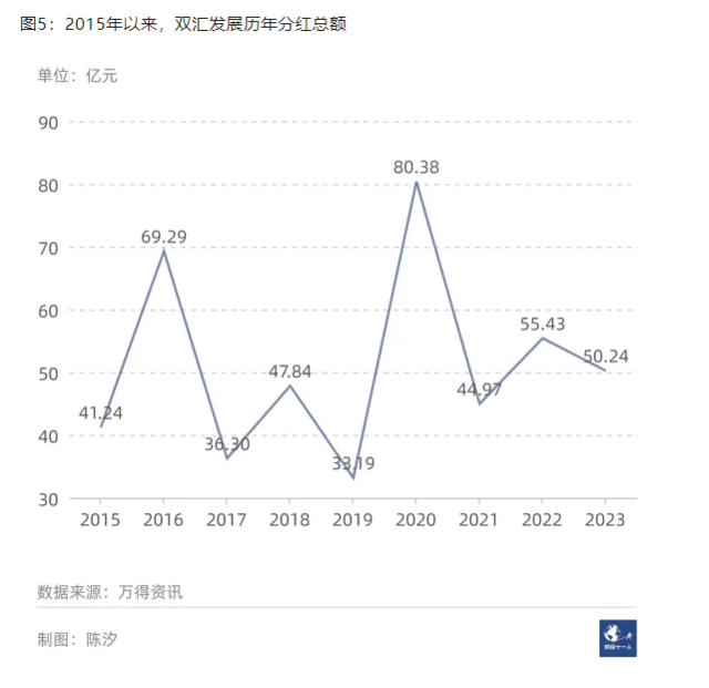 肉制品行业有7家样本公司,这里仅讨论双汇发展(000895.SZ),因为2023年双汇发展的分红占了行业分红总额的98%。2023年双汇发展分红总额为50.24亿元,股息率为5.33%。图5显示,2015年以来,双汇发展的分红基本保持在一个范围之内。