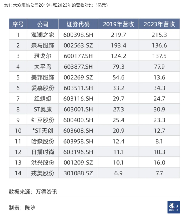 表1显示,大众服饰的14家样本公司中,9家公司2023年的营收小于2019年。2019年营收排名前5的公司,只有雅戈尔的营收略有增长。美邦服饰的营收从2019年的54.6亿元,下降到2023年的13.6亿元。