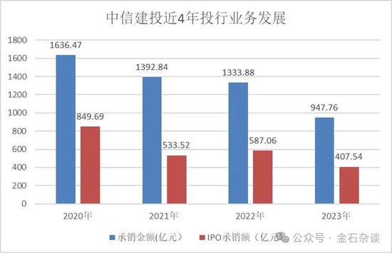 公司投行业务来看,2023年投行业务收入48亿,较2022年少了10亿,投行利润下滑36%。大家看中信建投近4年投行业务,即便不谈IPO收紧的2023年,中信建投承销金额也在一直在下滑。