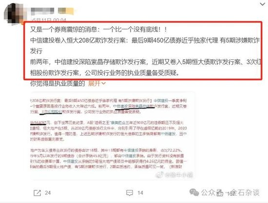 最近两天,在社区平台被一件事情刷屏了:又是一个券商震惊的消息:一个比一个没有底线!内容直指中信建投卷入恒大208亿欺诈发行案:最后9期450亿债券近乎独家代理,有5期涉嫌欺诈发行。