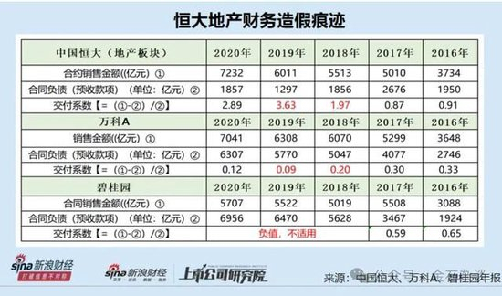 新浪财经用了一个数据来证明中介机构的视而不见。与有“高周转”之称的碧桂园相比,恒大地产的交付系数显得畸高。碧桂园2018年-2020年末的预收款项都比当年的合同销售金额高(有合理性,因为实际销售额以预收客户的款项为基础),这与恒大的状况截然不同。万科的情况与碧桂园相似,2018-2020年的销售金额与预收客户的款项相差不多。