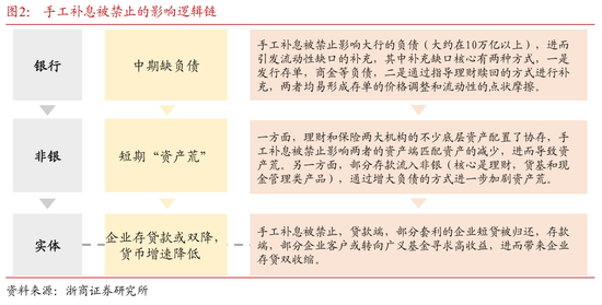 对银行的影响体现在中期缺负债逻辑。鉴于手工补息被禁止影响大行的负债(按照数据估计,涉及到手工补息存款的规模大约在10万亿以上,详见《对1年期存单收益率破2%的推演》),进而引发流动性缺口的补充,其中补充缺口核心有两种方式,一是发行存单、商金等负债,二是通过指导理财赎回的方式进行补充,两者均易形成存单的价格调整和流动性的点状摩擦。