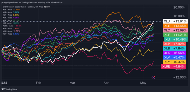 今年以来,美国公用事业SPDR ETF累计涨幅超过10%,跑赢标普和纳指。