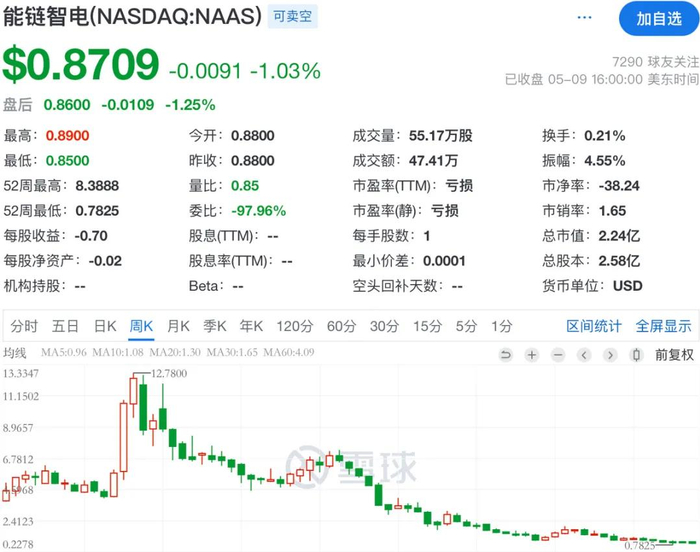 截至美东时间5月9日收盘,昔日“知名独角兽”能链智电美股股价已连续7个交易日跌破1美元,当时股价仅剩0.87美元。