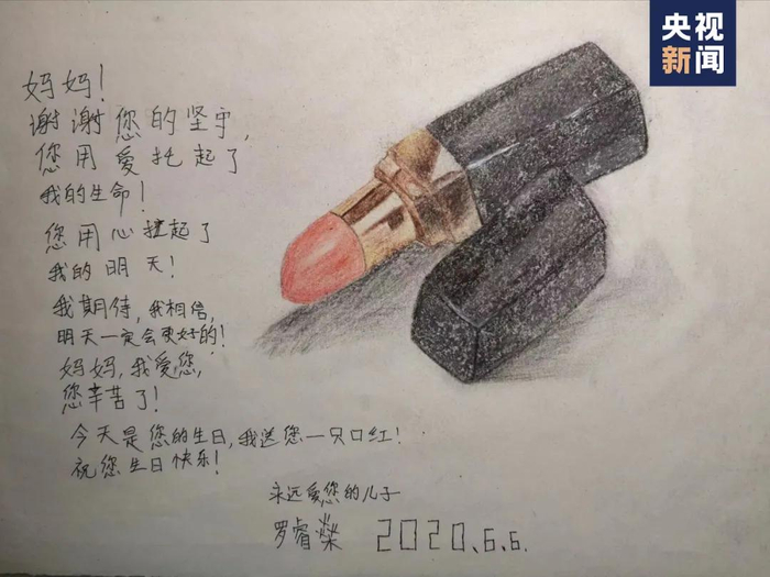 不善言辞的罗睿燊也经常用文字表达对妈妈的爱。他曾自学绘画,在妈妈生日时献上“一支口红”;曾毫不掩饰地感激妈妈的辛劳付出:“我生在妇女节后一天,这不就是在告诉我,是母亲给我创造了完整的生命,要记住妈妈们的不易。”